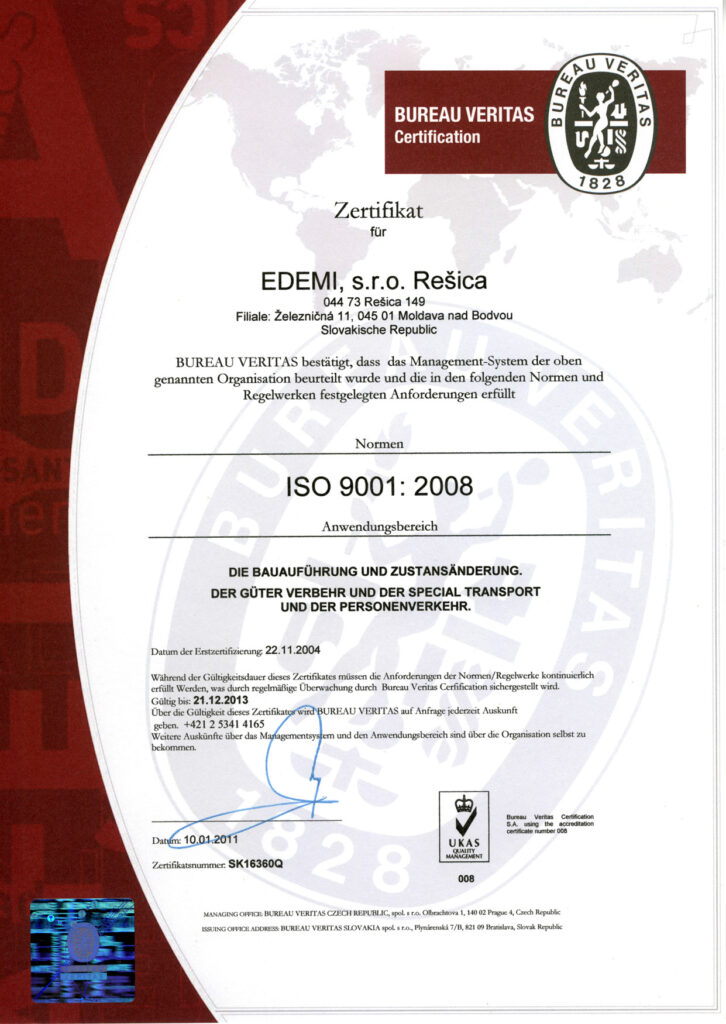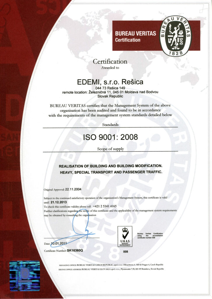 Spoločnosť EDEMI, s.r.o. Rešica má zavedený systém manažérstva kvality (SMK) podľa medzinárodného štandardu ISO 9001 : 2008 / EN ISO 9001 : 2008, ktorý certifikovala renomovaná certifikačná spoločnosť Bureau Veritas Certification Slovakia, spol. s r.o.. Certifikácia je pre uskutočňovanie stavieb a ich zmien a nákladnú, špeciálnu prepravu a osobnú prepravu.